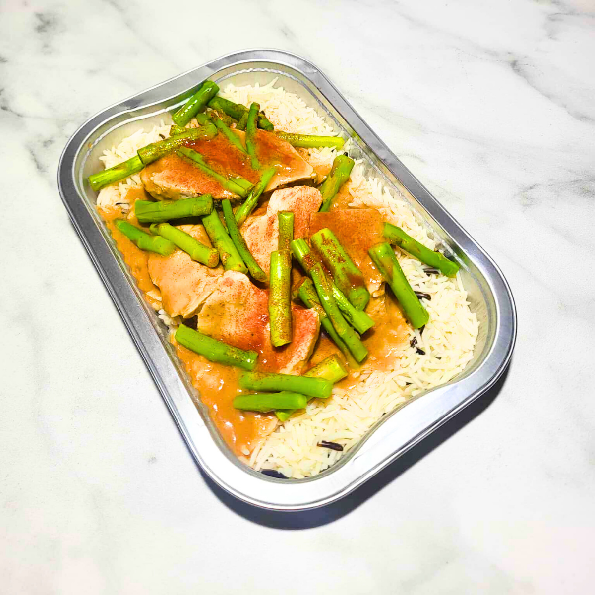 Prix unitaire parLES INGRÉDIENTS : Poulet, riz basmati, sauce demi-glace au gouda fumé, bouillon de poulet, mélange de légumes frais, ail, épices